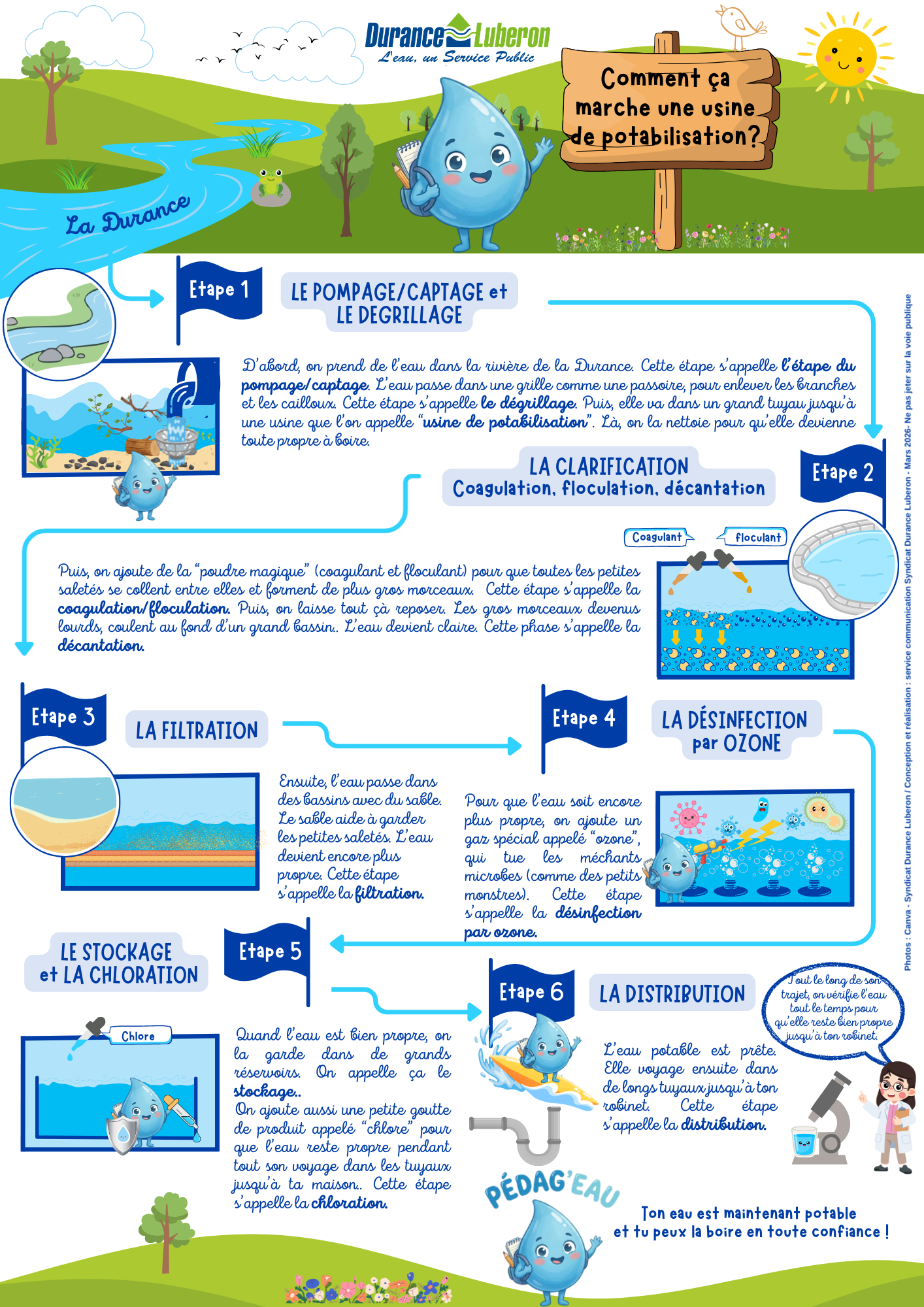 Comment l’eau devient-elle potable ? Découvrez les étapes de traitement en usine : filtration, désinfection et contrôle, sur l’Espace Pédag’eau du Syndicat Durance Luberon.